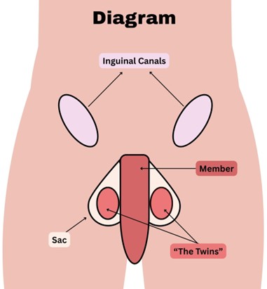 Before getting hands on, it helps to know what’s actually going on down there! Use the diagram above as a guide to the anatomy and the terms we mention. The twins naturally move between the sac and the inguinal canals. During early development, the twins descend from these canals. For many, they can be gently guided back up into these canals during tucking.